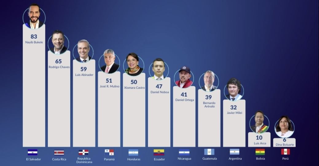 El top lo lidera Bukele de El Salvador con el puntaje más alto de 83 y le siguen Rodrigo Chaves de Costa Rica.