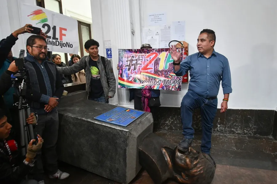 El diputado opositor Alberto Astorga tumbó este viernes una estatua del expresidente boliviano Evo Morales (2006-2019) y luego pisó su cabeza, como recordatorio de los 9 años del referéndum que negó la posibilidad al exmandatario de reformar la Constitución para habilitar la reelección indefinida.