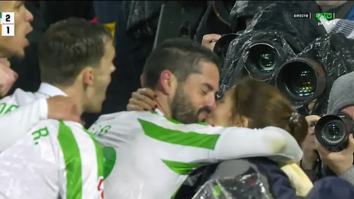 El verdiblanco se dejó llevar por la emoción del momento. En primera instancia, se deslizó con las rodillas para celebrar el tanto, pero pronto se dirigió a la grada. Allí le esperaba su pareja, Sara Sálamo, con la que se fundió en un apasionado beso.