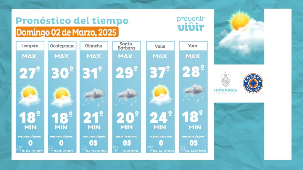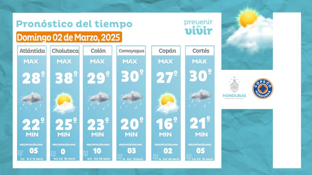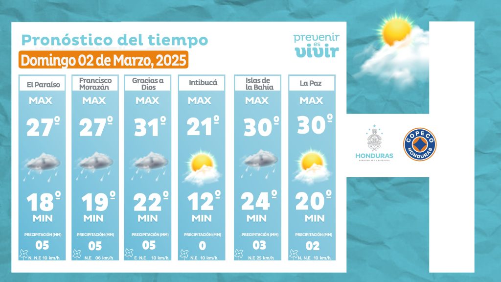 La Comisión Permanente de Contingencias (Copeco), ha informado este domingo que producto de el viento del noreste mantendrá el transporte de humedad desde el mar Caribe hacia el territorio nacional, produciendo lluvias y chubascos débiles y dispersos en el norte.
