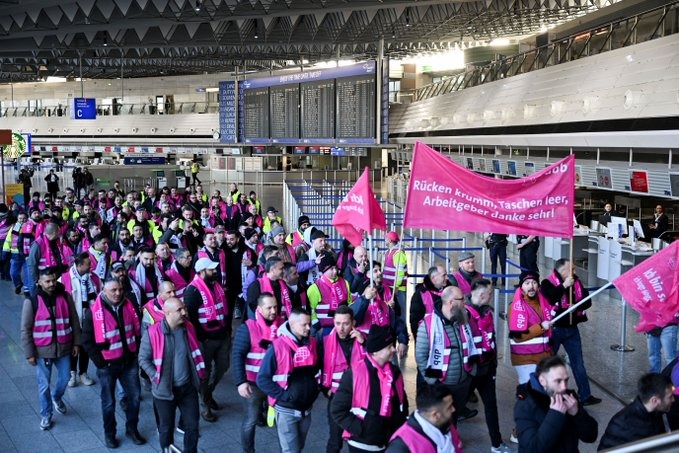 El paro fue convocado por el sindicato ver.di. Se lleva a cabo en once de los principales aeropuertos para reclamar mejoras salariales para los empleados que trabajan en el sector público y en los servicios de asistencia en tierra.