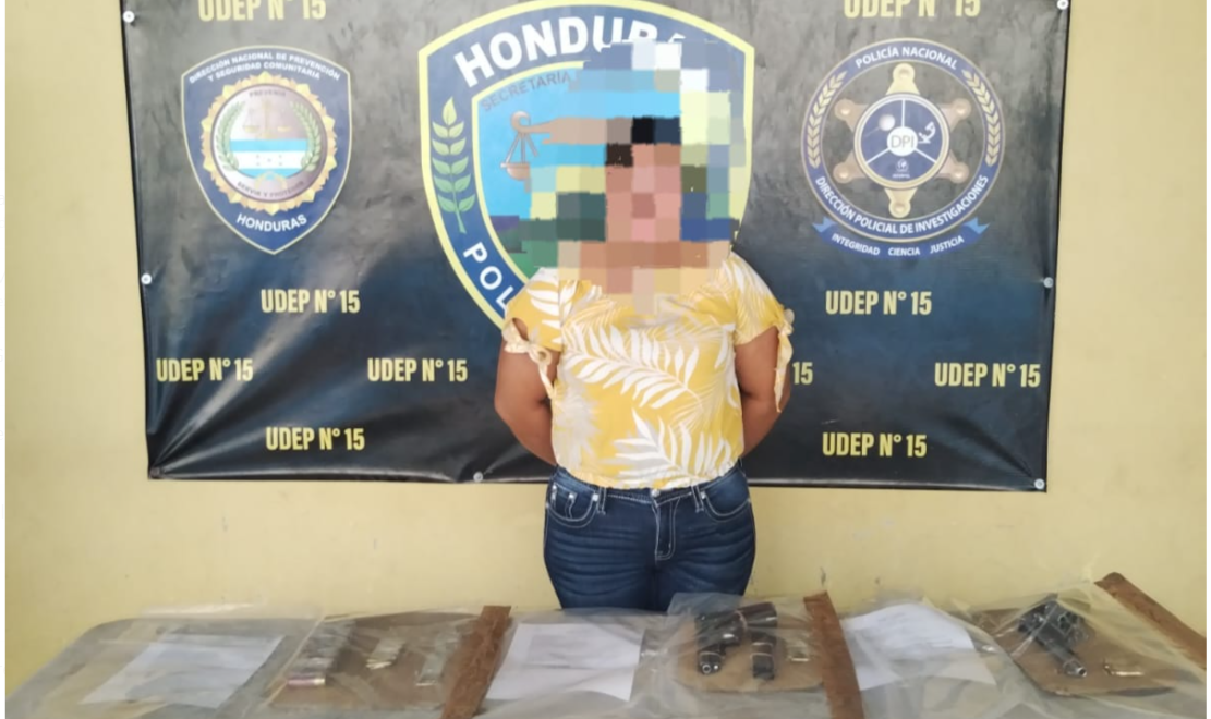 La sospechosa de 33 años, originaria de Juticalpa, Olancho, se le dio detención mediante allanamiento de morada realizado por funcionarios policiales en el que se le encontró en posesión de varias armas de fuego, por lo que se remitió para el respectivo proceso.
