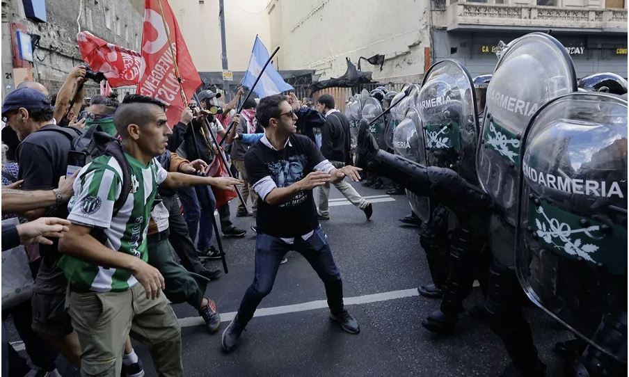La convocatoria había sido lanzada en principio para acompañar la habitual marcha de los jubilados de los miércoles, pero los barras y los militantes se impusieron al frente de la manifestación, cortaron la calle y se cruzaron con las fuerzas de seguridad.