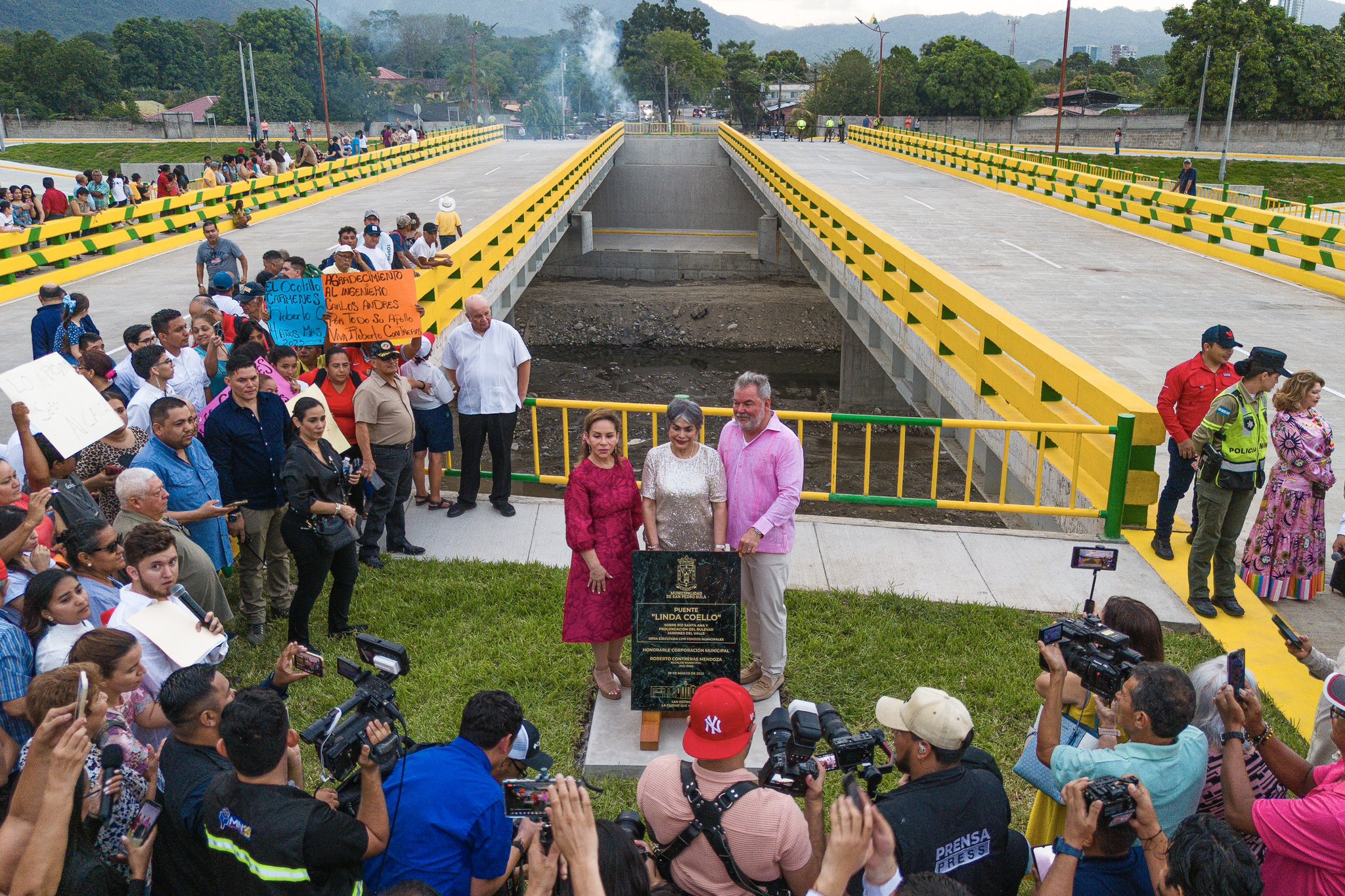 El puente lleva por nombre Linda Coello en honor a la presidenta y fundadora de la organización solidaria Capacitación, Educación, Producción, Unificación, Desarrollo, Organización, Cepudo desde donde sirve a los desamparados beneficiando a miles de sampedranos.