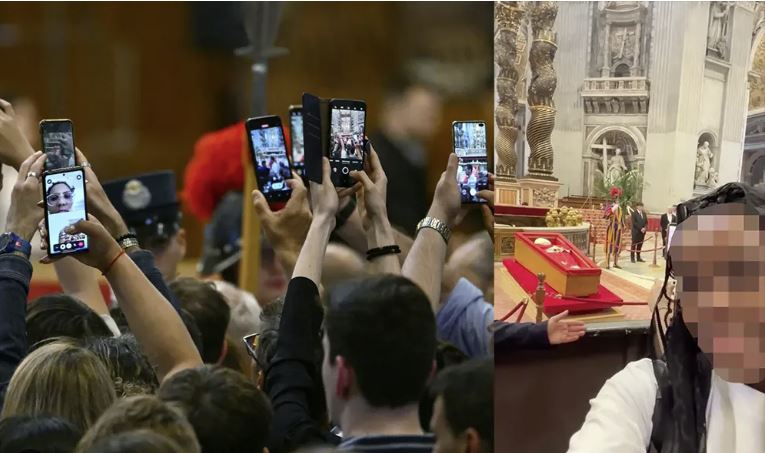 En las últimas horas se han difundido imágenes de personas que, tras horas de espera, aprovechan los pocos segundos que las autoridades dejan detenerse ante el féretro para hacerse una autofoto junto al cuerpo de Francisco dentro del ataúd para luego publicarlas en redes sociales.