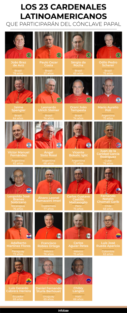 El cónclave que elegirá al sucesor del papa Francisco iniciará el próximo miércoles a las 16:30 hora local con la entrada y clausura de los 133 cardenales electores en la Capilla Sixtina del Vaticano. 23 de ellos son latinomericanos: Brasil tendrá siete representantes; Argentina cuatro, México dos; y Cuba, Nicaragua, Guatemala, Ecuador, Perú, Colombia, Chile, Paraguay, Uruguay y Haití, uno cada uno.