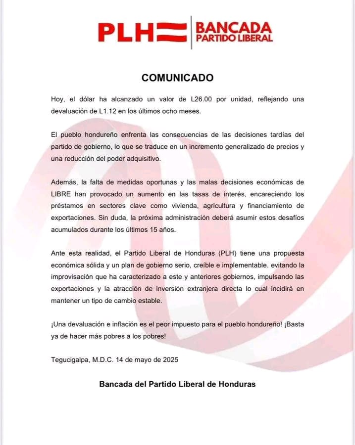La bancada del Partido Liberal de Honduras (PLH) emitió un comunicado en el que responsabiliza al gobierno actual por la devaluación del lempira, que recientemente alcanzó un valor de 26 lempiras por dólar.
