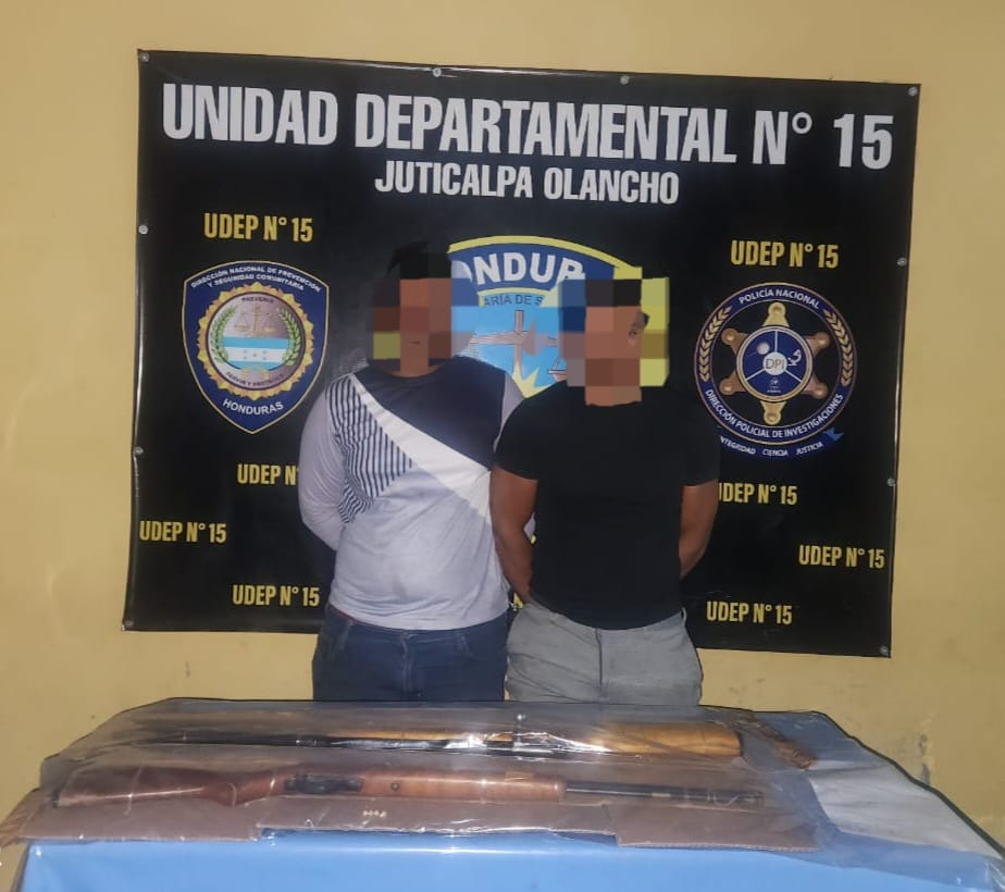 Mediante patrullaje móvil se les dio detención a dos hombres de 20 y 33 años, originarios del municipio de Juticalpa y residentes en aldea San Marcos de Jutiquile, ya que al momento de ser requerido por el personal policial se les encontró en posesión de dos armas de fuego sin la documentación legal correspondiente.