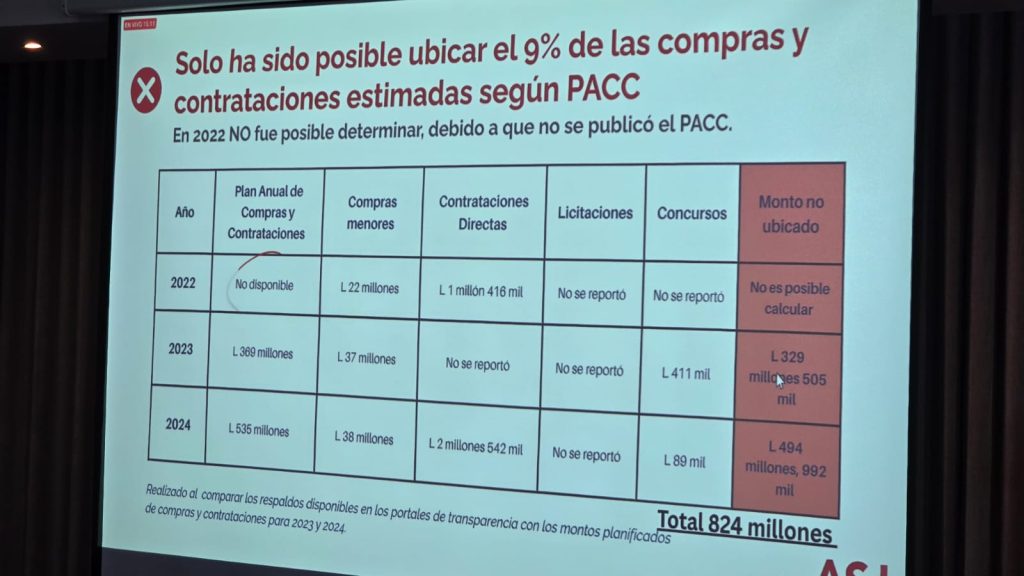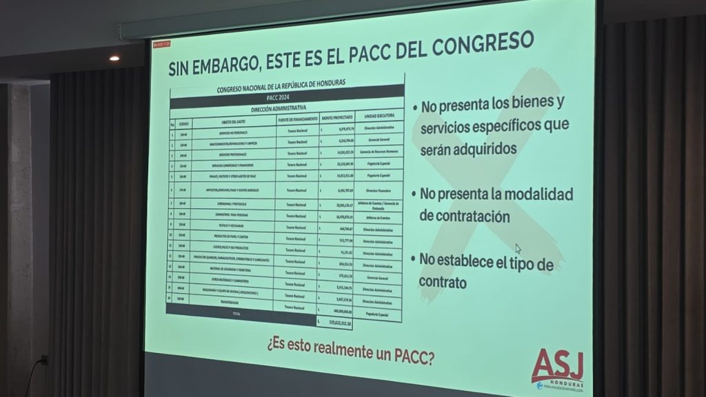 El análisis, basado en información recopilada a través de solicitudes de acceso a la información pública y portales oficiales de transparencia, documenta que el Poder Legislativo no publicó su Plan Anual de Compras y Contrataciones (PACC) correspondiente al año 2022 y los correspondientes a 2023 y 2024 no cumplen con los criterios y especificaciones que establecen la Ley de Transparencia y Acceso a la Información Pública, y la Oficina Normativa de Contratación y Adquisiciones del Estado (ONCAE). Esta omisión impide verificar el uso de los recursos públicos y abre la puerta a decisiones discrecionales en el manejo del presupuesto legislativo.