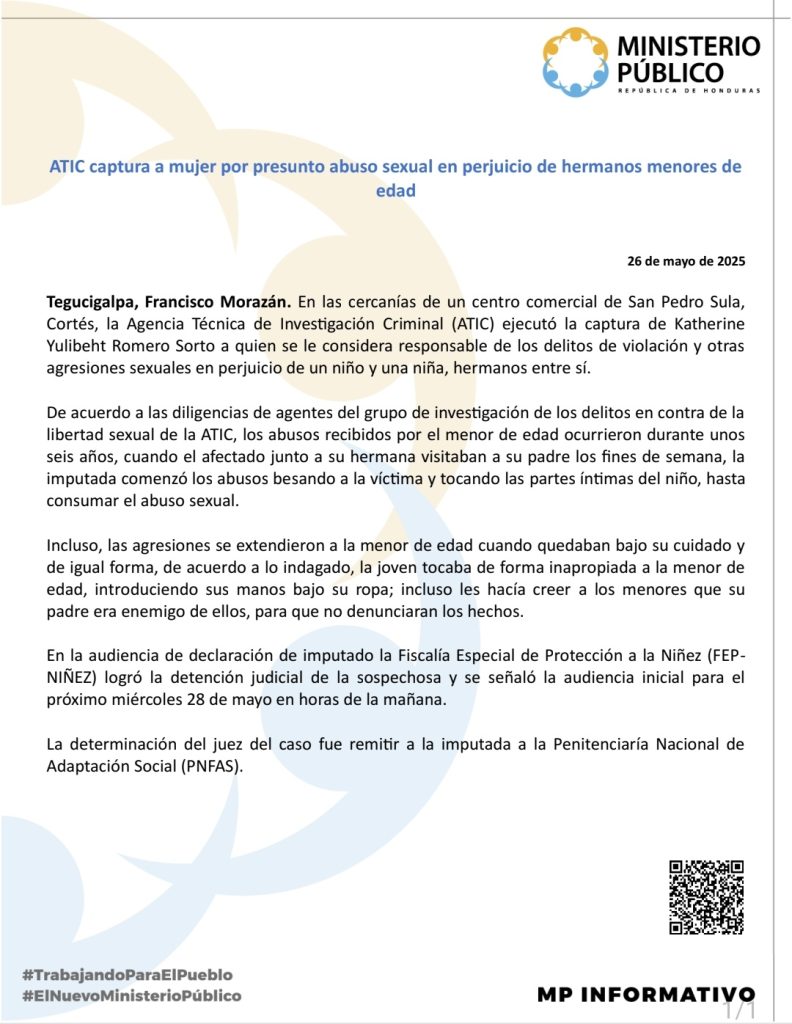 La Agencia Técnica de Investigación Criminal (ATIC) ejecutó este viernes la captura de Katherine Yulibeht Romero Sorto, quien es señalada de cometer los delitos de violación y otras agresiones sexuales en perjuicio de dos menores de edad, un niño y una niña, hermanos