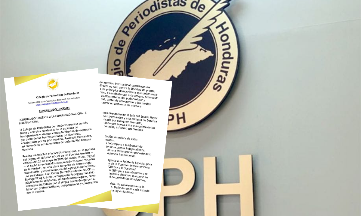 El Colegio de Periodistas de Honduras (CPH) alzó la voz este lunes ante lo que ellos califican como un «ataque» del Jefe del Estado Mayor, Roosevelt Hernández, y de la ministra de Defensa, Rixi Moncada, esto luego de la publicación, en la portada digital de las Fuerzas Armadas un titular donde se referían a los comunicadores, Rodrigo Wong Arévalo, Juan Carlos Sierra y el ganador del premio Álvaro Contreras 2025, Dagoberto Rodríguez, donde les calificaba de «sicarios de la verdad».