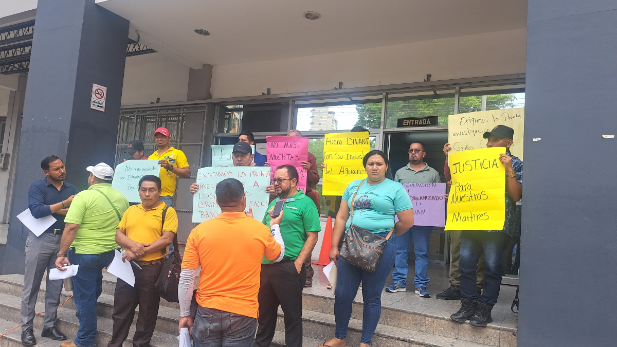 En el Ministerio Público se mantiene una protesta por parte de miembros de la Plataforma Agraria del Bajo Aguán de Colón, esto contra de compañías industriales del municipio y exigiendo justicia en la muerte del ambientalista Juan López.