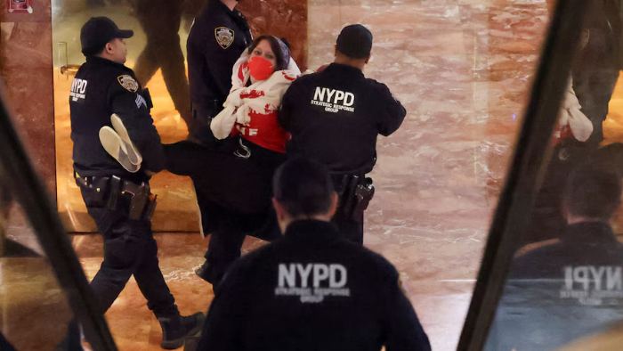 Las imágenes captadas por asistentes y periodistas revelan que los activistas permanecieron sentados durante varios minutos, mientras oficiales del Departamento de Policía de Nueva York (NYPD) con esposas plásticas intentaban contener la situación. A través del sistema de altavoces del edificio, se les advirtió en repetidas ocasiones que serían arrestados si no desalojaban el área.