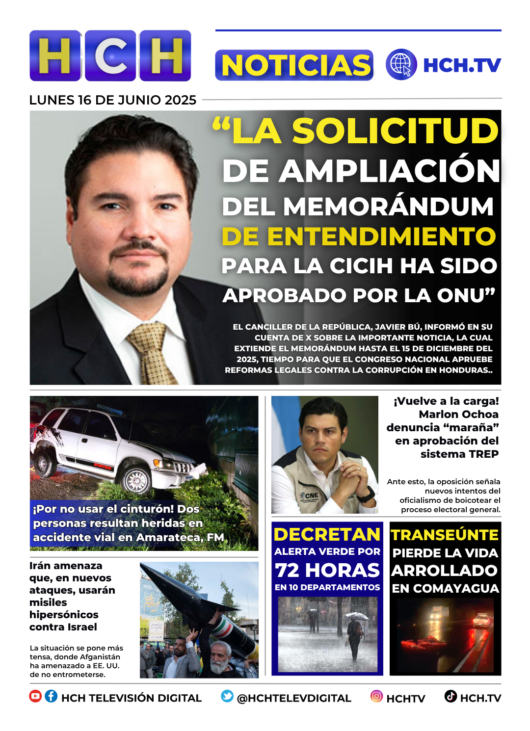 © 2025 - HCH Televisión Digital - Noticias de Honduras y el Mundo. Anillo Periférico, Complejo Empresarial Tegucigalpa, Honduras, C.A. Tel: (504) 2235-3245 / 2235-3246 / 2235-4875 / 2235-4876 LLÁMENOS GRATIS DESDE EE.UU: 3052801682 y 3052801735 © Copyright 2025 - HCH Televisión Digital. Todos nuestros contenidos están protegidos con derechos de autor.