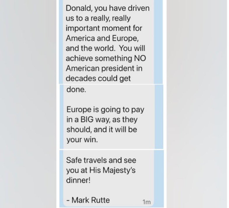 “Donald, nos has llevado a un momento verdaderamente importante para América, Europa y el mundo”, continúa el mensaje. “El esfuerzo de Europa será considerable, como debe ser, y esta será tu victoria”, concluye supuestamente Rutte, según el contenido difundido por Trump.