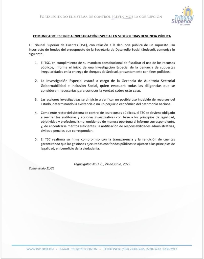 El Tribunal Superior de Cuentas informó a través de un comunicado, este martes, que iniciará una investigación especial tras la denuncia de supuestas irregularidades con respecto a la entrega de cheques de la Secretaría de Desarrollo Social (Sedesol).