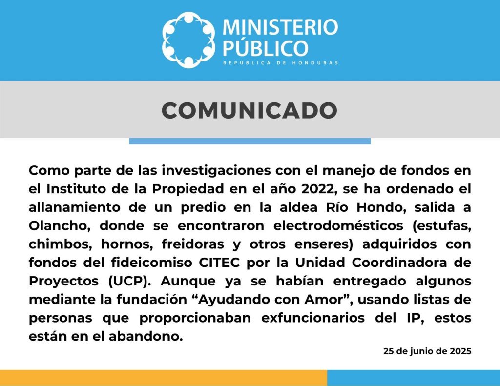 El Ministerio Público ha informado sobre un allanamiento realizado en la aldea Río Hondo, en la salida hacia Olancho, como parte de una investigación por presunto mal manejo de fondos en el Instituto de la Propiedad (IP) durante el año 2022.