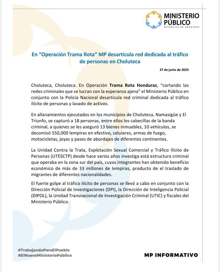 Una red criminal dedicada al tráfico ilícito de personas y al lavado de activos fue desarticulada en el departamento de Choluteca, como resultado de la operación denominada “Trama Rota Honduras”.