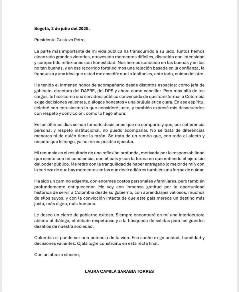 La canciller Laura Sarabia le presentó su renuncia al presidente Gustavo Petro, a quien le envió una carta deseándole un bien cierre de gobierno y diciéndole que su determinación se da por decisiones que se han tomado en los últimos días y que no comparte. Su dimisión se da luego de una intensa pelea con el proceso para la elaboración de los pasaportes.