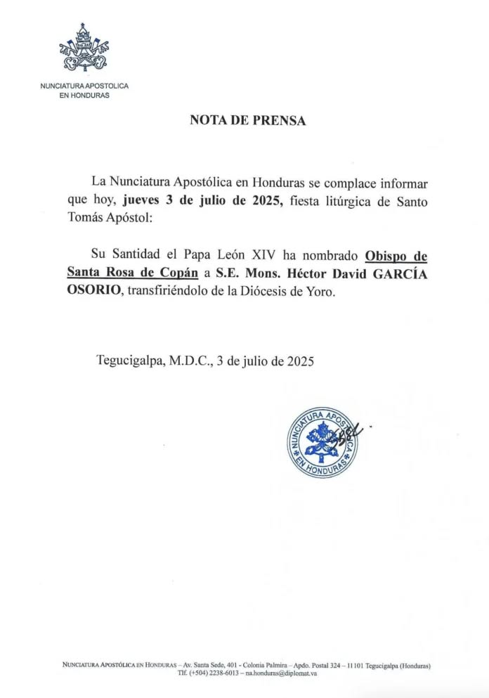 La Nunciatura Apostólica en Honduras anunció este jueves que el papa León XIV ha designado a monseñor Héctor David García Osorio como nuevo Obispo de la Diócesis de Santa Rosa de Copán.