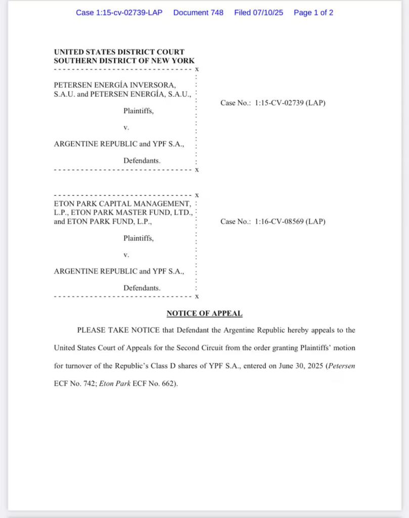 El Gobierno argentino apeló el jueves ante la Justicia de Estados Unidos el fallo del 30 de junio que obligaba al país a entregar el 51% de sus acciones en la petrolera YPF a unos inversores que demandaron al país tras la nacionalización de la empresa.