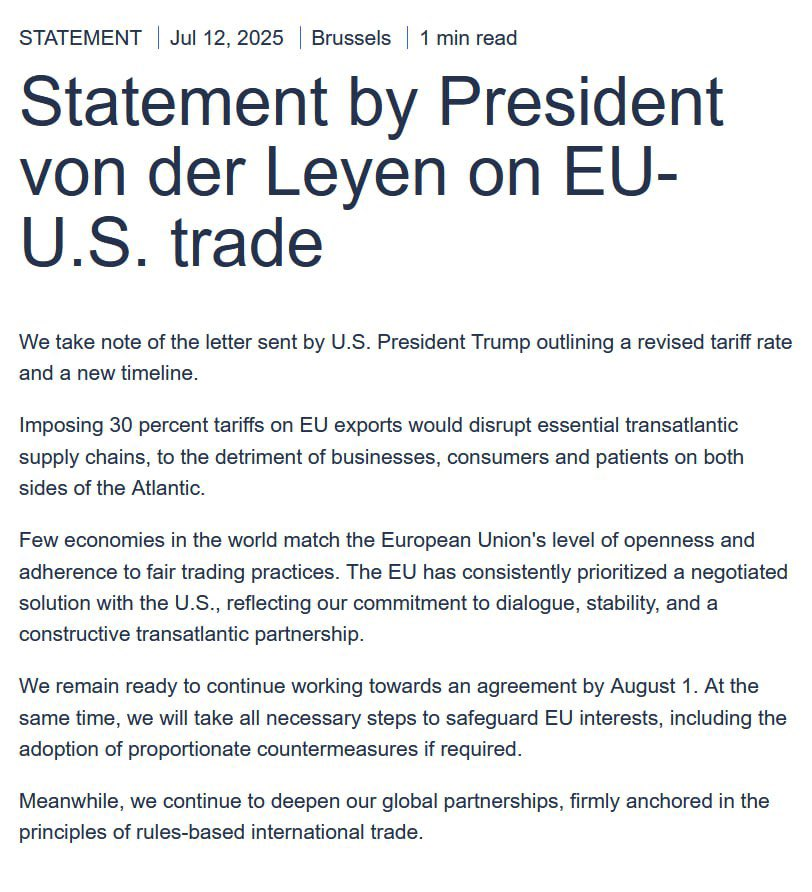 La presidenta de la Comisión se manifestó sobre el comercio entre la UE y EEUU: «Tomamos nota de la carta enviada por el presidente estadounidense Trump, en la que se describe un tipo arancelario revisado y un nuevo plazo. Imponer aranceles del 30 % a las exportaciones de la UE interrumpiría las cadenas de suministro transatlánticas esenciales, en detrimento de empresas, consumidores y pacientes a ambos lados del Atlántico. Pocas economías en el mundo igualan el nivel de apertura y adhesión a prácticas comerciales justas de la Unión Europea. La UE ha priorizado sistemáticamente una solución negociada con EEUU, lo que refleja nuestro compromiso con el diálogo, la estabilidad y una asociación transatlántica constructiva. Seguimos dispuestos a seguir trabajando para alcanzar un acuerdo antes del 1 de agosto. Al mismo tiempo, tomaremos todas las medidas necesarias para salvaguardar los intereses de la UE, incluida la adopción de contramedidas proporcionadas si es necesario. Mientras tanto, seguimos profundizando nuestras alianzas globales, firmemente arraigadas en los principios del comercio internacional basado en normas».