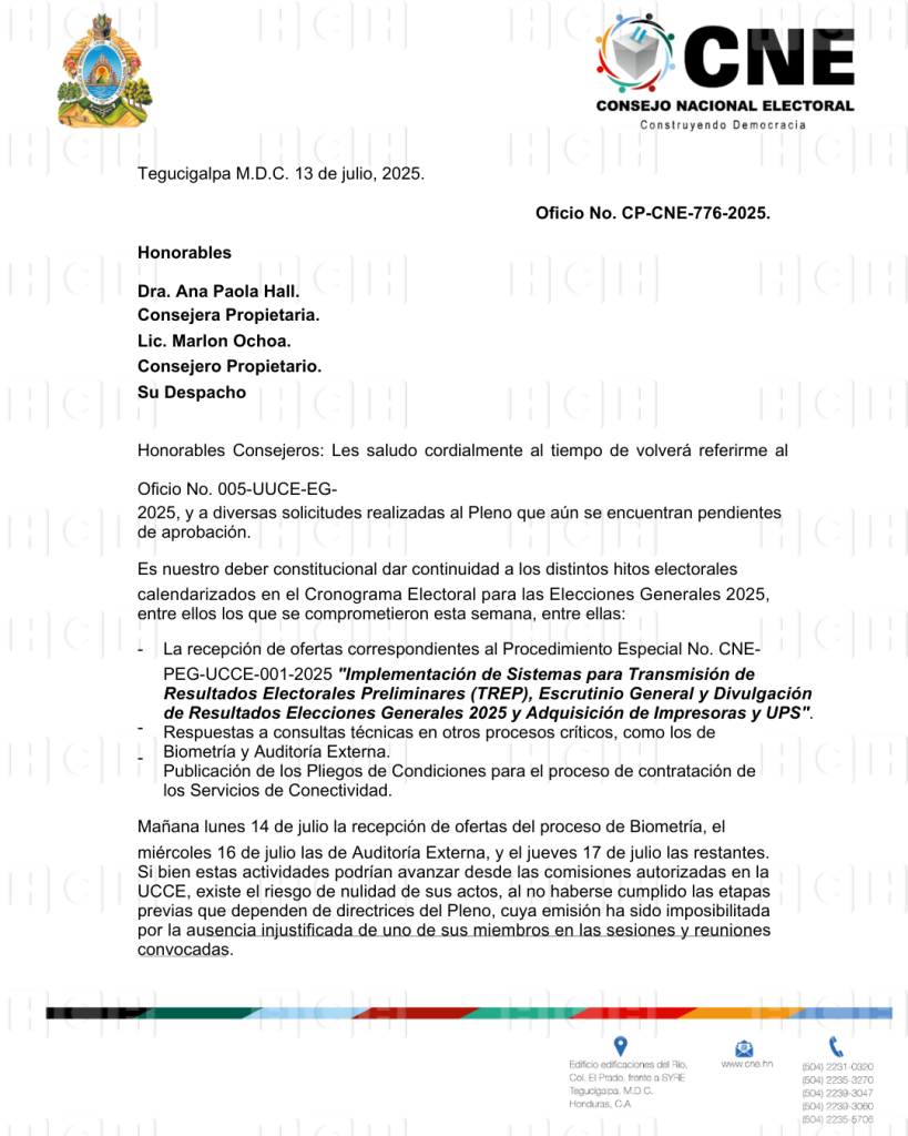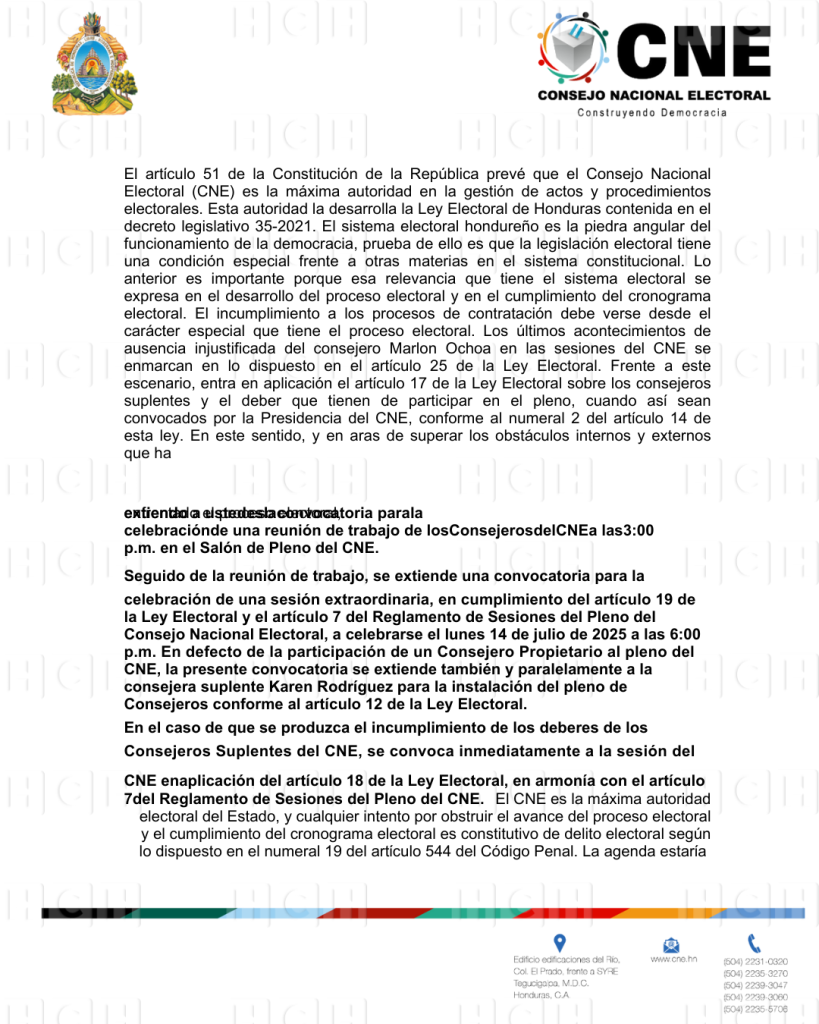 El departamento de prensa de HCH obtiene en exclusiva un documento del CNE donde señalan convocatoria a reunión para instalar pleno por mayoría para dar seguimiento al cronograma electoral de cara a las elecciones generales del 2025.
