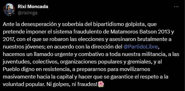 La candidata de Libre, Rixi Moncada lanzó un llamado público y enérgico a través de redes sociales, en el que acusa al bipartidismo tradicional de intentar imponer un sistema electoral que califica como fraudulento, citando como ejemplo los procesos de 2013 y 2017.