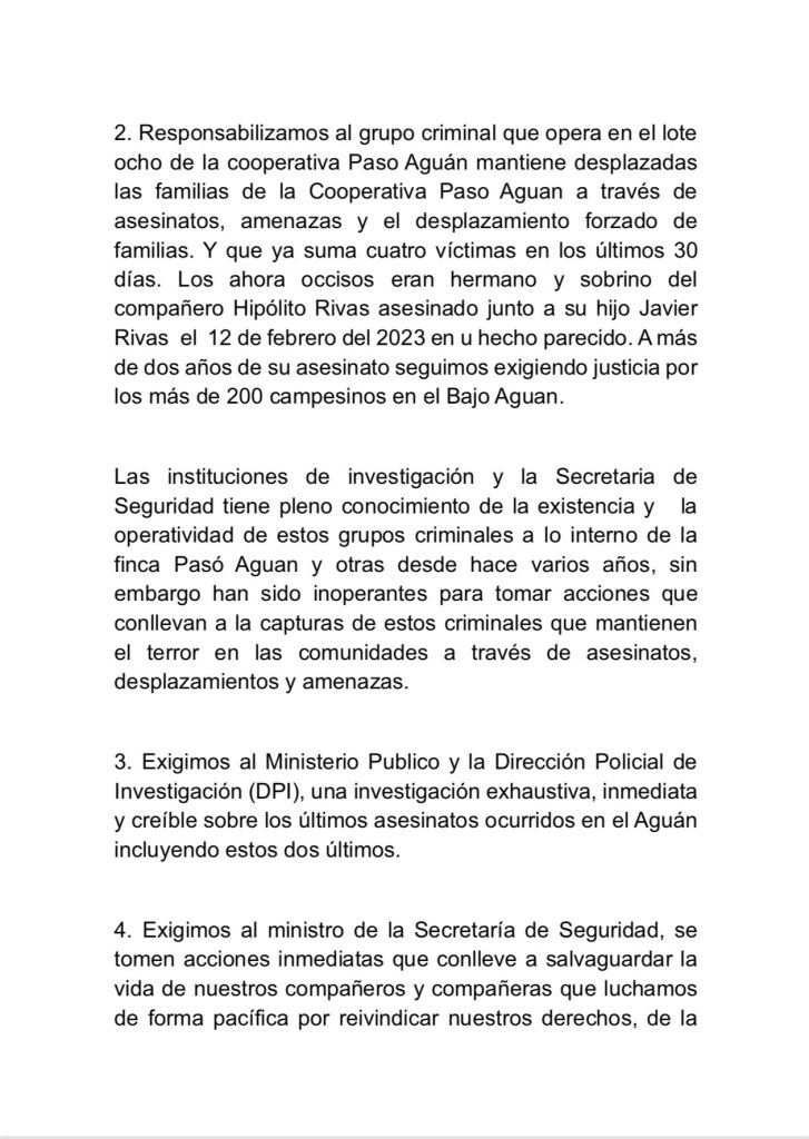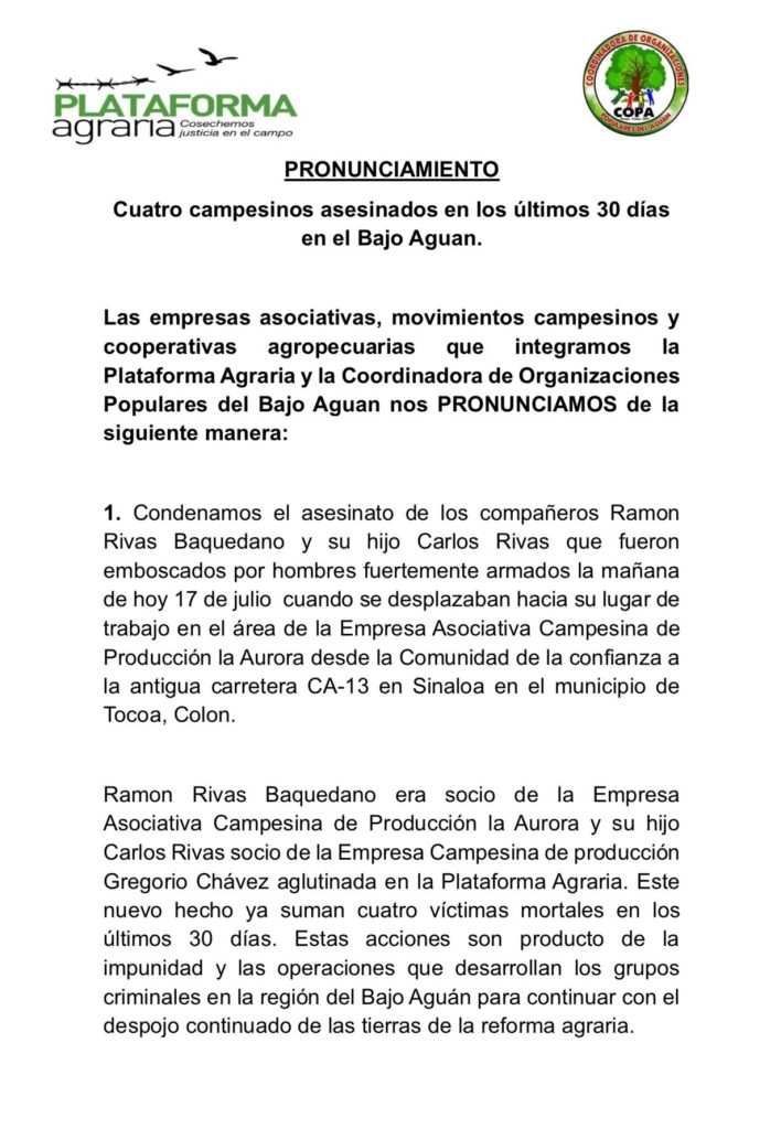 «Exigimos al Ministerio Publico y la Dirección Policial de Investigación (DPI), una investigación exhaustiva, inmediata y creíble sobre los últimos asesinatos ocurridos en el Aguán incluyendo estos dos últimos», dice parte del comunicado.