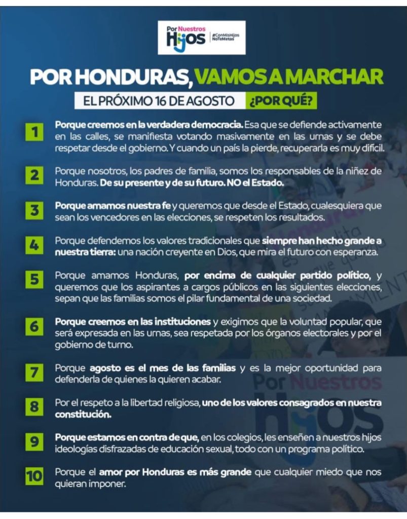 «Porque agosto es el mes de las familias y es la mejor oportunidad para defenderla de quienes la quieren acabar. Por el respeto a la libertad religiosa, uno de los valores consagrados en nuestra Constitución. Porque estamos en contra de que en los colegios, les enseñen a nuestros hijos ideologías disfrazadas de educación sexual», dice parte del comunicado en donde informan las razones que tienen para marchar.