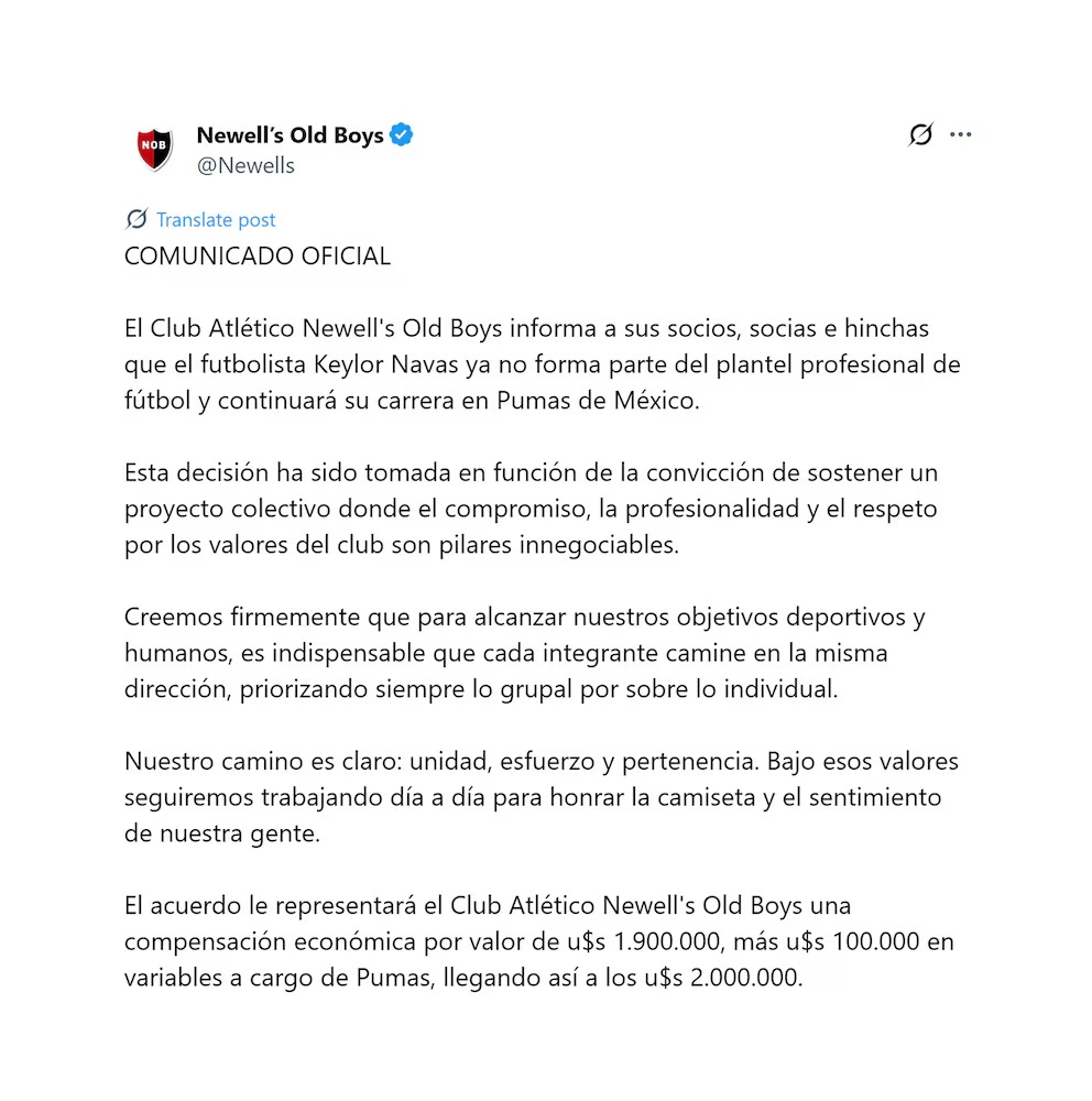 Todavía no existía una versión oficial de Newell’s en relación a la partida del arquero costarricense, hasta la aparición del comunicado, en el que se cuestiona al futbolista por su comportamiento, aparte de brindar detalles del dinero que ingresará en la tesorería rojiengra.