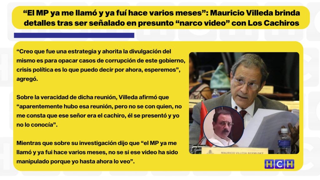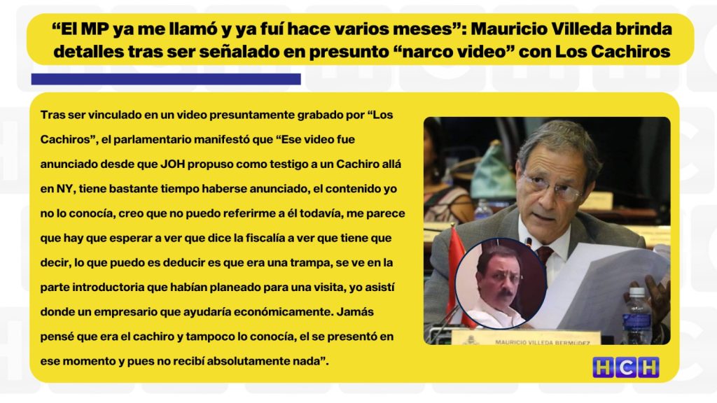 “Ese video fue anunciado desde hace mucho tiempo, el contenido no lo conocía. Me parece que era una trampa: se ve en la parte introductoria que habían planeado una visita y yo asistí donde un empresario que, supuestamente, ayudaría económicamente. Jamás pensé que era un Cachiro y tampoco lo conocía”, declaró Villeda, señalando que no recibió dinero ni beneficios durante ese encuentro.