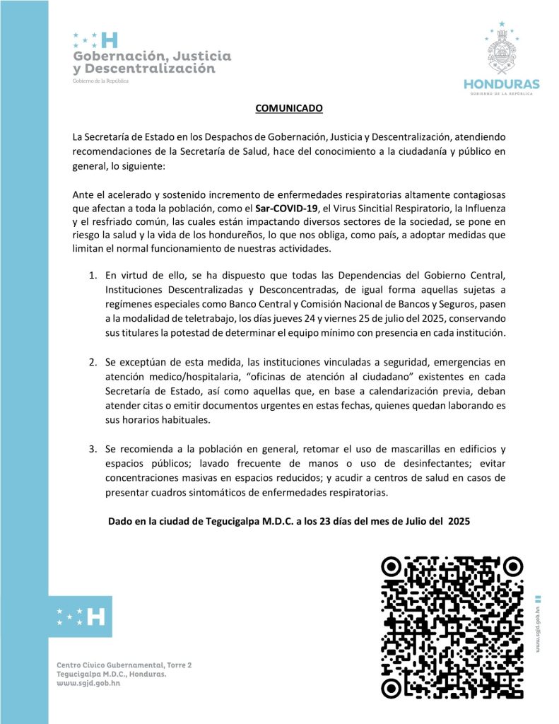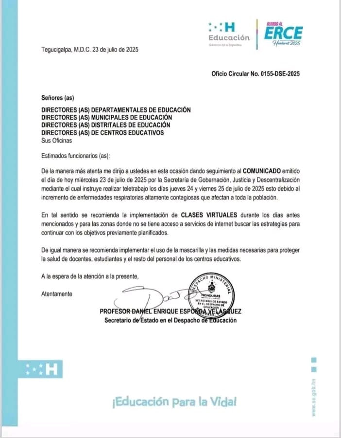 La Secretaría de Educación instruyó este jueves que los días jueves 24 y viernes 25 de julio se trabajará bajo la modalidad de teletrabajo y clases virtuales en el sistema educativo. La medida, dirigida a autoridades y centros escolares, busca prevenir contagios ante el aumento de enfermedades respiratorias en el país.
