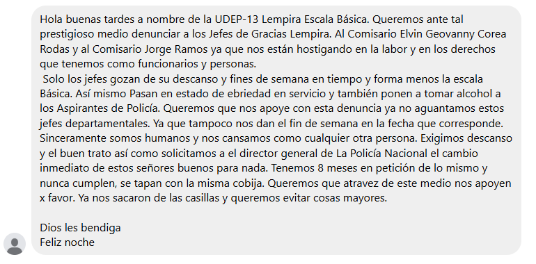 El uniformado quien se encuentra en servicio en la UDEP-13 de Gracias Lempira, afirmó que hay comisarios que se encargan de hostigar al personal dejando a un lado sus derechos. Además que toman bebidas alcohólicas estando en servicio y «ponen a tomar a los aspirantes a policías».