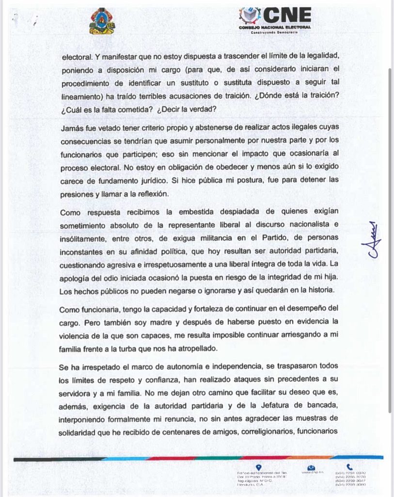 La consejera del Consejo Nacional Electoral (CNE), Ana Paola Hall, presentó su renuncia al cargo de consejera del ente electoral este viernes ante el Congreso Nacional e informó que su decisión fue por culpa de las autoridades partidarias y de su Partido Liberal.
