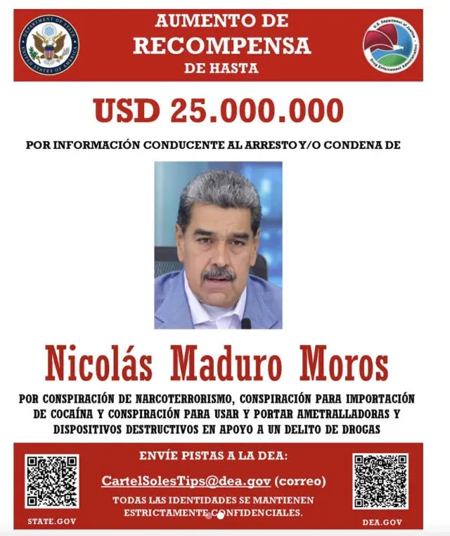 La Administración de Control de Drogas de los Estados Unidos (DEA, por sus siglas en inglés) ha publicado un anuncio en el que ofrecen 25 millones de dólares por información que lleve a la captura o condena de Nicolás Maduro.