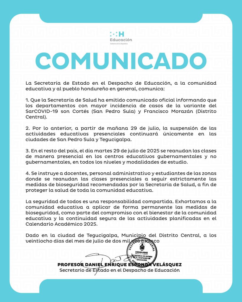 Atendiendo las recomendaciones de la Secretaría de Salud, mañana martes 29 de julio se reanudan las clases presenciales en todo el país, excepto en San Pedro Sula y el Distrito Central, donde se mantendrá la modalidad virtual debido a la alta incidencia de casos de COVID-19.