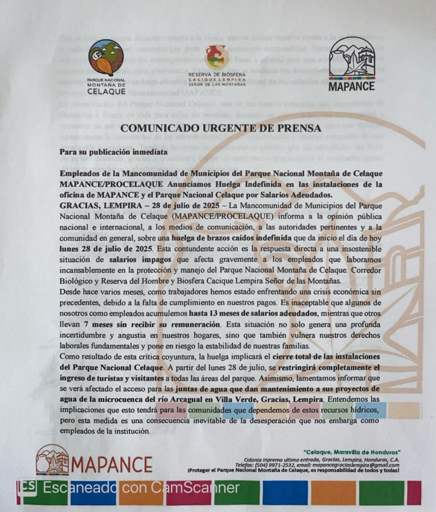 La crisis laboral en el parque nacional «Montaña de Celaque», ubicado en el departamento de Lempira, alcanzó un nuevo punto crítico este martes, cuando empleados decidieron tomarse las instalaciones en protesta por el incumplimiento en el pago de sus salarios.