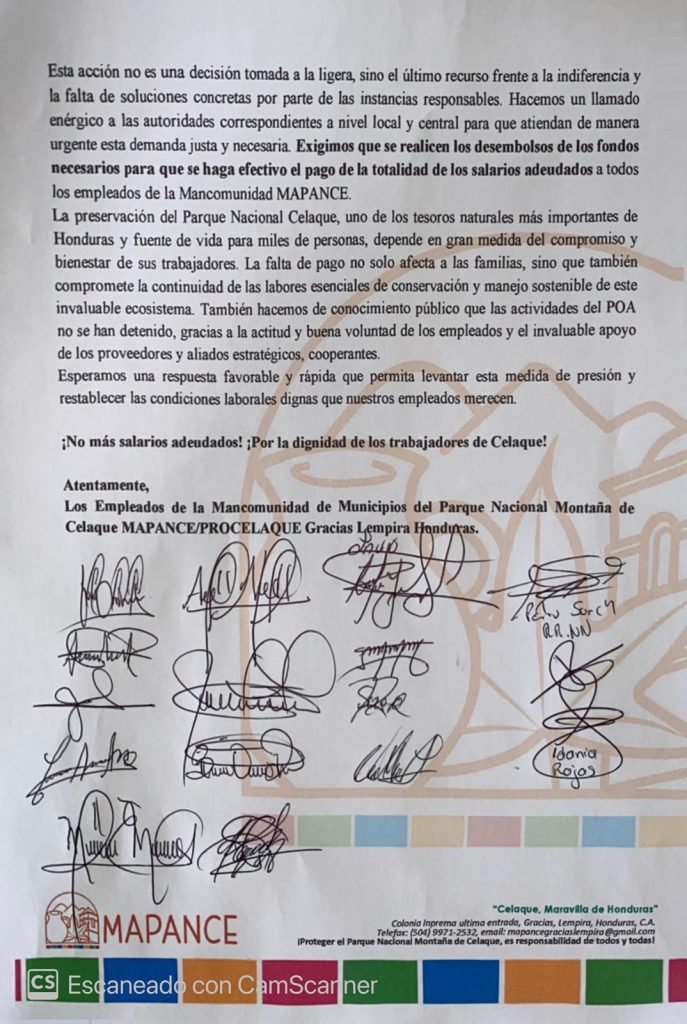 “Los afectados somos 16 empleados en diferentes programas, nuestro trabajo es velar por la conservación del parque, tenemos un convenio con el ICF para proteger nuestra área protegida”, agregaron.