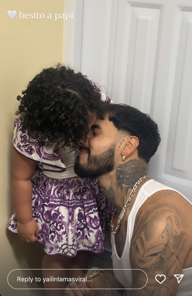 En otro tierno video de IG Stories la bebé aparece muy contenta tras bambalinas con su papá. «¡Otro besito a papá!», exclama Yailin fuera de cámara mientras grababa la tierna escena. De inmediato Cattleya responde dándole un piquito a Anuel quien con ojos cerrados recibe el tierno gesto de su hija.