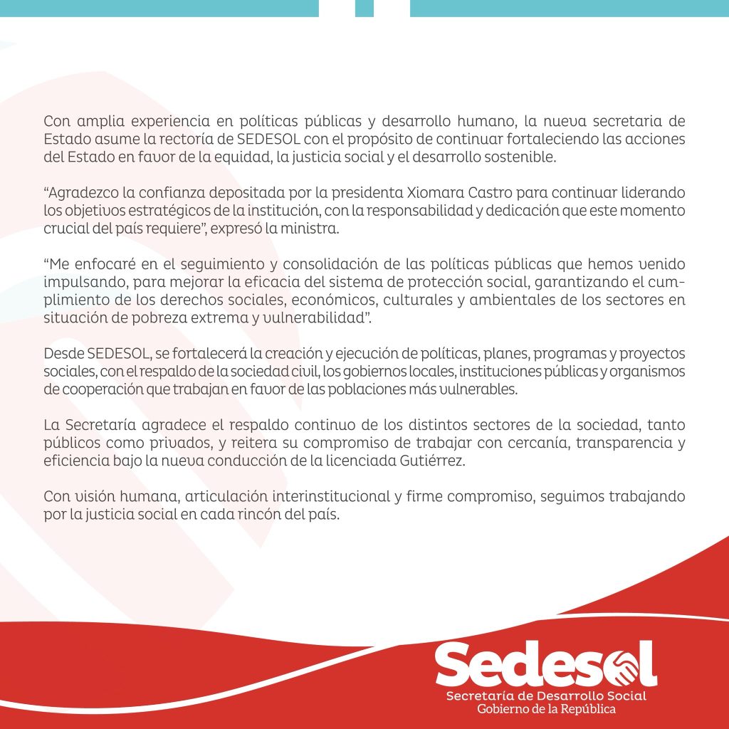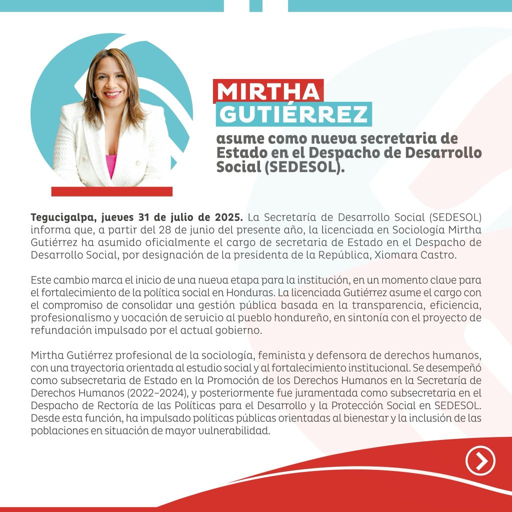 La presidenta Xiomara Castro nombró a Mirtha Gutiérrez como nueva titular de la Secretaría de Desarrollo Social (SEDESOL), esto luego de la separación de José Carlos Cardona por el escandalo denominado «Chequesol».