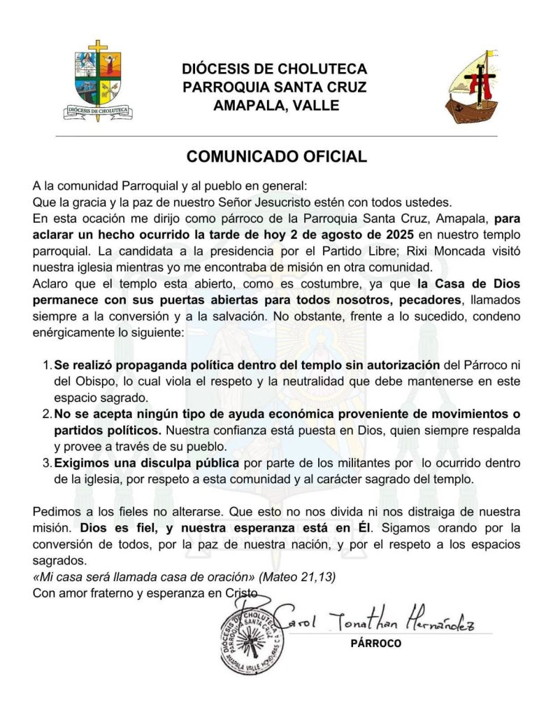 La Parroquia Santa Cruz de Amapala, Valle, condena enérgicamente la propaganda que realizó la presidenciable Rixi Moncada al entrar al templo sin autorización ni permiso del párroco ni del obispo, por su lado, aclaran que no aceptan ningún tipo de ayuda económica proveniente de movimientos o partidos políticos. «Exigimos una disculpa pública por parte de los militantes por lo ocurrido dentro de la iglesia», expresa el comunicado.
