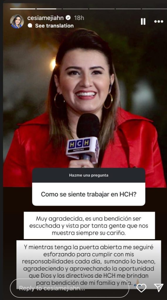 La reconocida periodista de HCH, Cesia Mejía, compartió un mensaje en sus historias de Instagram donde expresó su agradecimiento por la oportunidad de formar parte del equipo del canal.