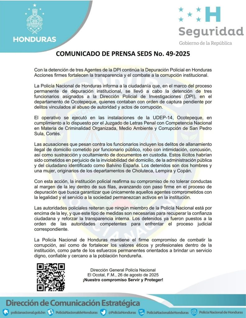Los policías, dos hombres y una mujer originarios de Choluteca, Lempira y Copán, enfrentan acusaciones por allanamiento ilegal de domicilio, robo con intimidación, concusión y sustracción de documentos en custodia. Estos delitos habrían sido cometidos en perjuicio de la administración pública y del ciudadano Balvino España, según detalló la institución.