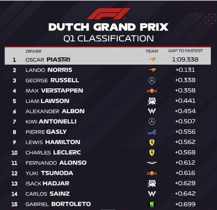 Sin sorpresas, los dos pilotos de McLaren, el australiano Oscar Piatri y el británico Lando Norris, partirán desde la primera línea de la parrilla en el Gran Premio de Países Bajos de Fórmula 1, el domingo a partir de las 13:00 GMT en el circuito de Zandvoort.