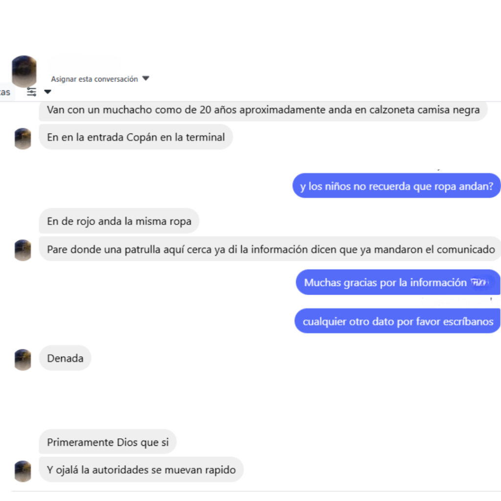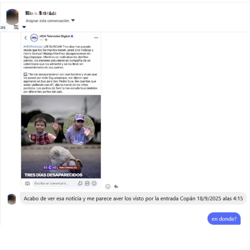 Luego de ver la publicación en las redes sociales, una televidente nos escribió para informarnos que había visto a los dos menores en una terminal de buses en La Entrada, Copán.