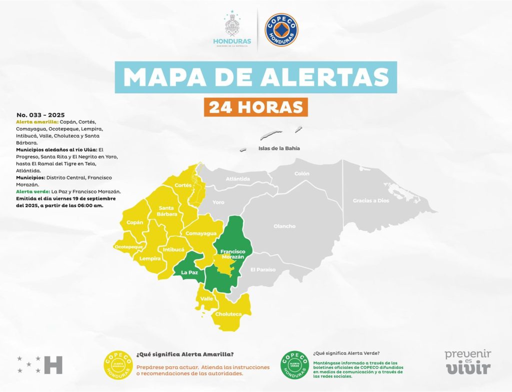 Además, continúan en Alerta Amarilla los departamentos de Santa Bárbara, Ocotepeque, Copán, Lempira, Cortés, Comayagua, Intibucá, Valle, Choluteca y el Distrito Central en Francisco Morazán.