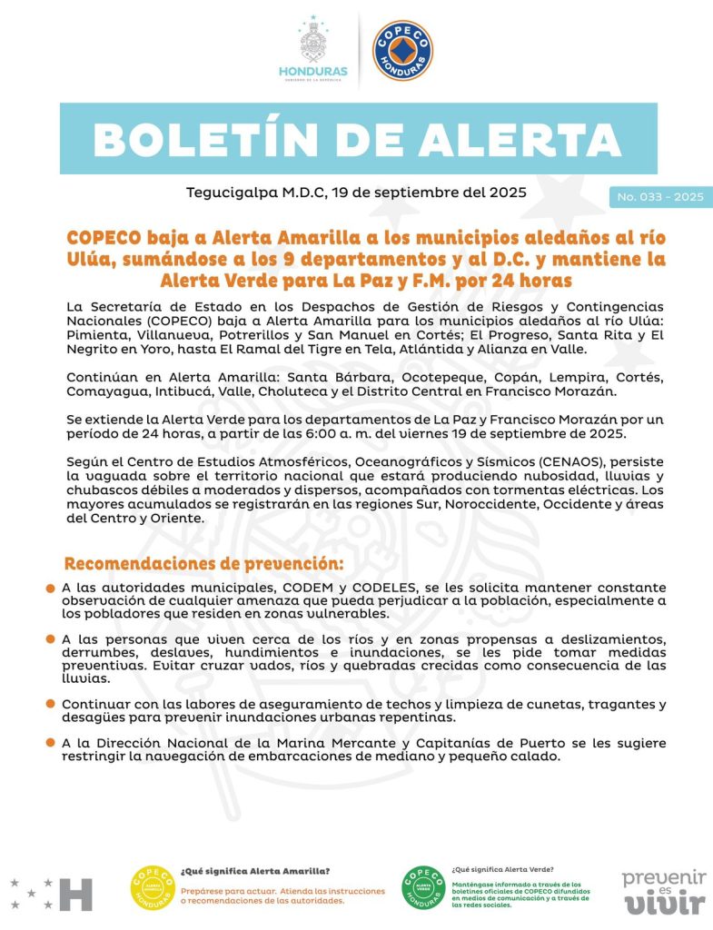 La Comisión Permanente de Contingencias (COPECO), baja a Alerta Amarilla los municipios aledaños al río Ulúa: Pimienta, Villanueva, Potrerillos y San Manuel, Cortés; El Progreso, Santa Rita y El Negrito en Yoro, hasta el ramal del Tigre en Tela, Atlántida y Alianza Valle.