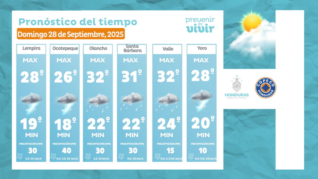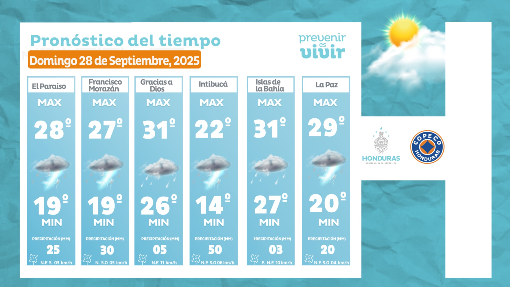 Condiciones secas en la mayor parte del país por la mañana, mientras que, por la tarde la convergencia de viento y humedad proveniente desde el mar Caribe y del océano Pacífico sobre el territorio nacional, producirán lluvias y chubascos débiles a moderadas y dispersos con tormentas eléctricas sobre las regiones de el occidente, centro, sur y oriente, asimismo se producirán precipitaciones débiles en el norte del país.