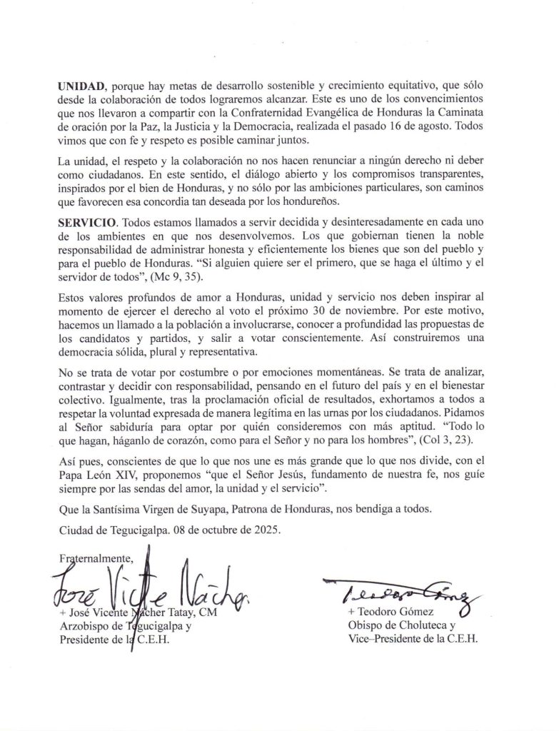 Estos valores profundos de amor a Honduras, unidad y servicio nos deben inspirar al momento de ejercer el derecho al voto el próximo 30 de noviembre. Por este motivo, hacemos un llamado a la población a involucrarse, conocer a profundidad las propuestas de los candidatos y partidos, y salir a votar conscientemente. Así construiremos una democracia sólida, plural y representativa.